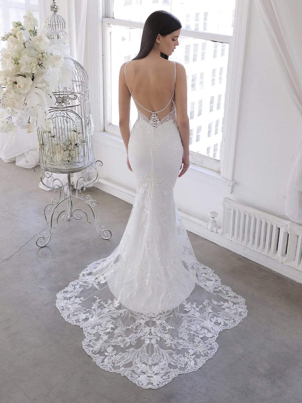 Delicate, dreamy, dramatic – Omari is perfect for the modern bride who wants both exquisite detailing and unique versatility. Intricate floral embroidered lace travels from the romantic sweetheart neckline bodice and low illusion back down to the soft and sleek stretch georgette skirt. The gorgeous scalloped lace hem easily connects to the detachable lace train extension for that extra glam option for the ceremony.