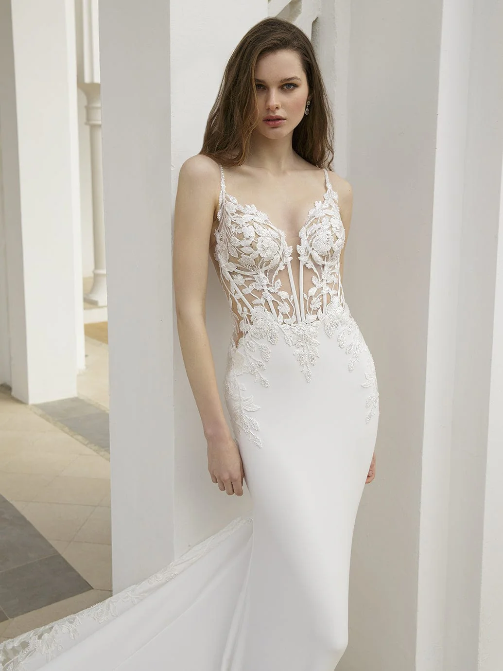 You can have it all with this sexy and sophisticated mermaid gown featuring a heart-stopping corset-style bodice and alluring side cut-outs to accentuate your curves. The sequined floral lace is carefully placed throughout the neckline, bodice, and the illusion back. The lovely lace detailing flows down from the back into a graceful scalloped lace-cut hem, effortlessly catching everyone’s attention.