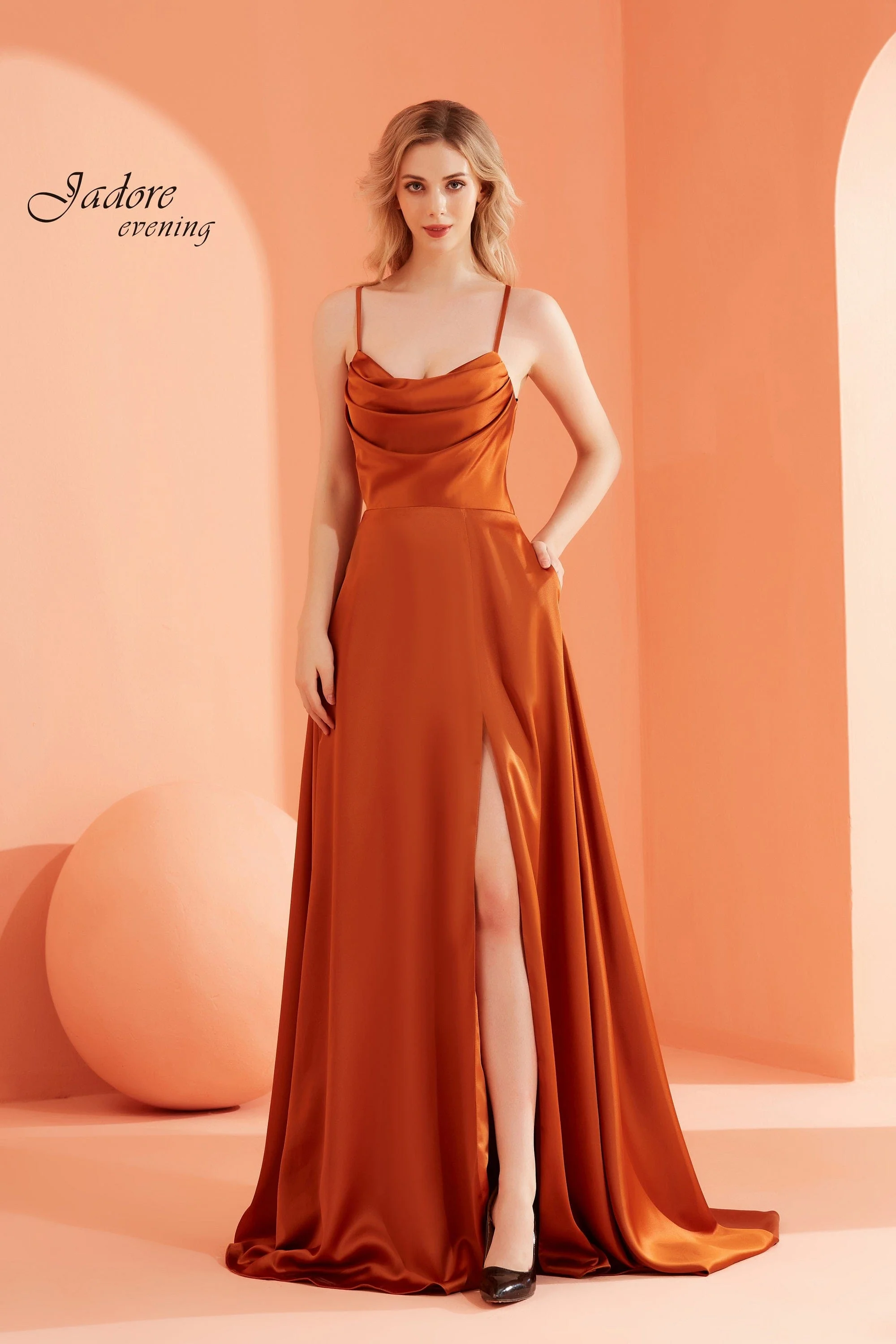 A soft and delicate silk satin A-line dress that is perfect for all special occasions. J22055 features a pleated cowl neckline and a gorgeous corset back with a sweeped train.