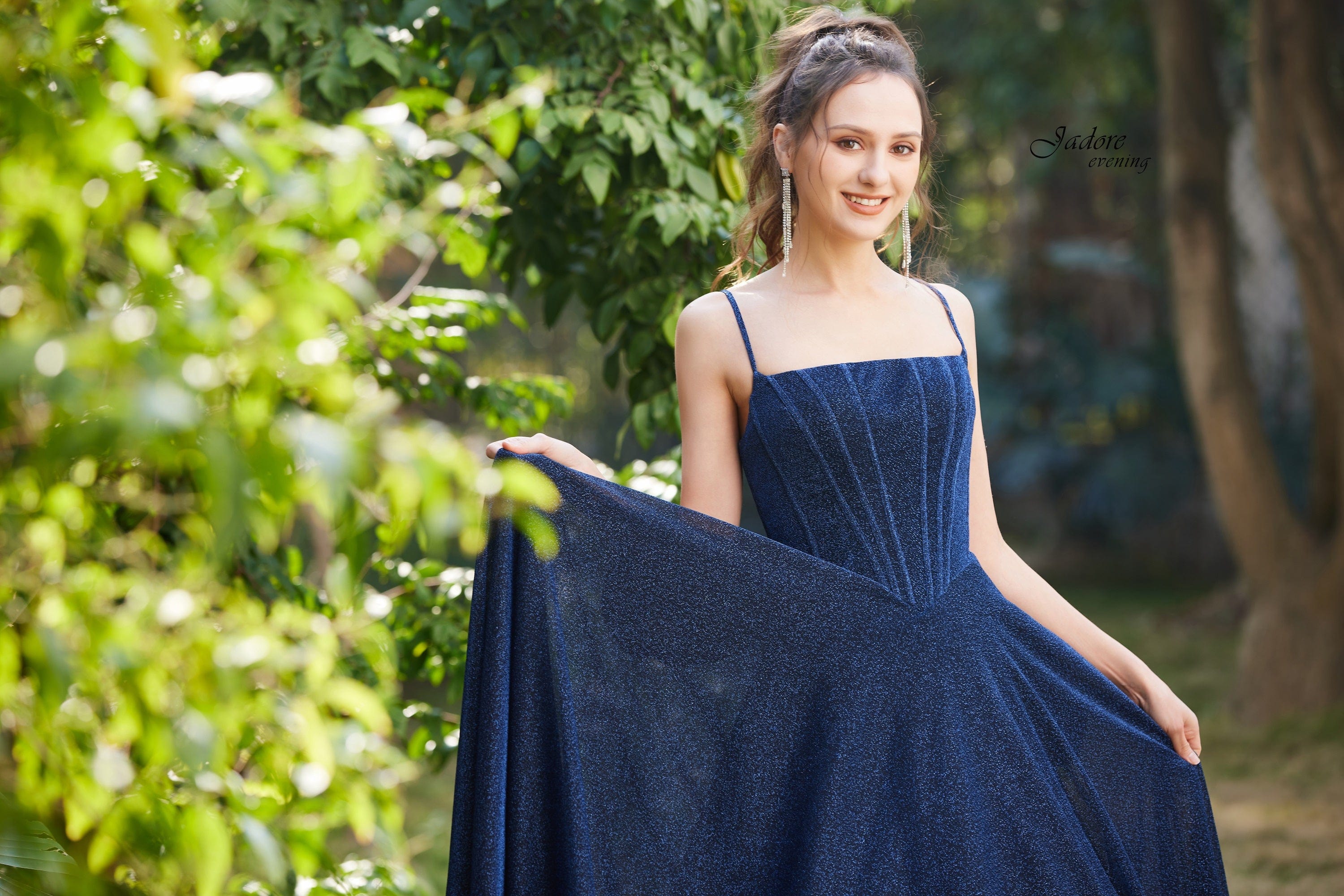 J21021 is designed with a square neckline corset bodice featuring exposed boning.