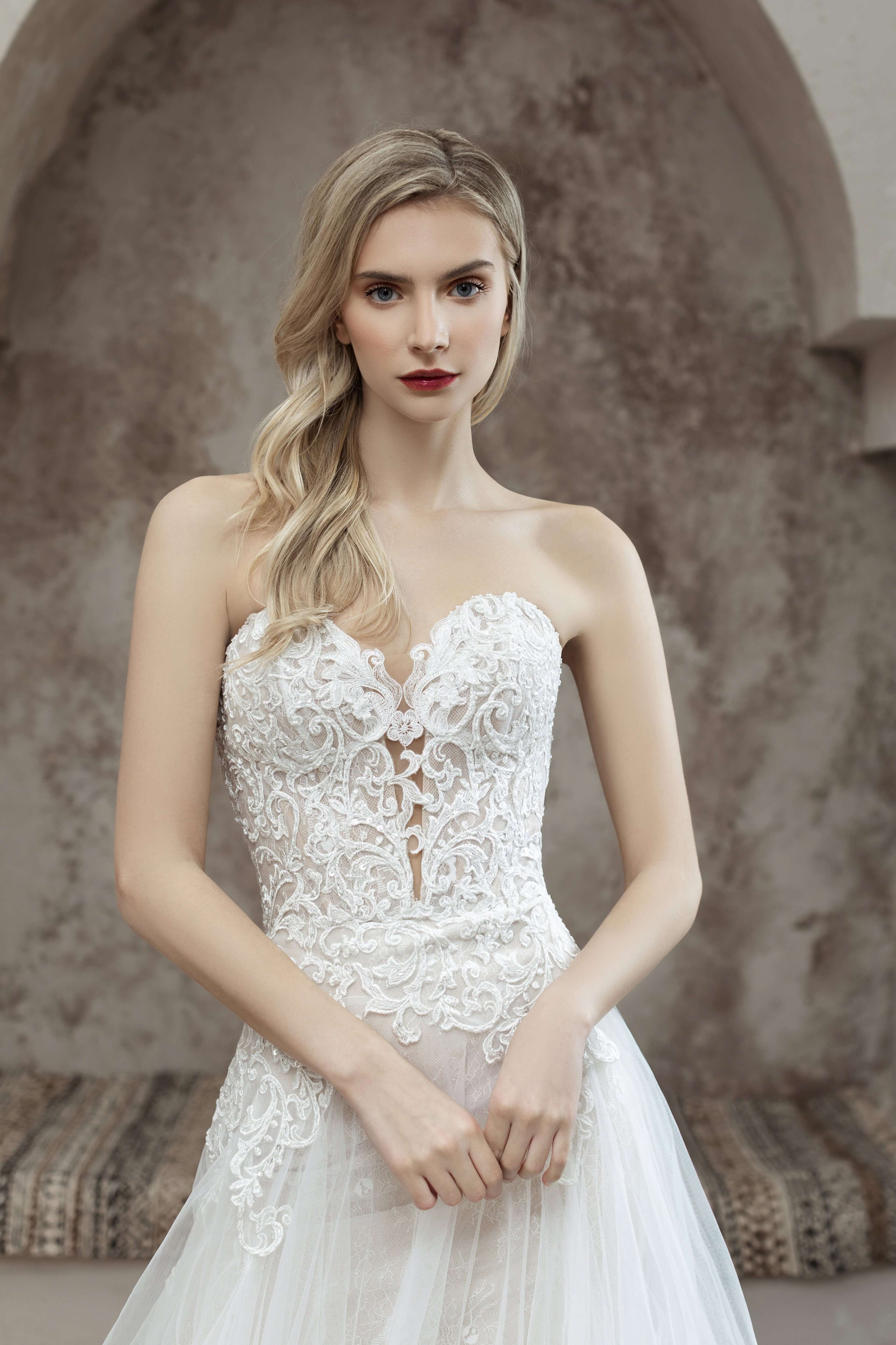 This soft tulle A-line wedding dress is the epitome of a romance! It features striking organic lace that adorns the entire bodice with an universally flattering sweetheart neckline. Deep V with sheer tulle inset and lace on top give just enough sexiness but not too much. The flowy skirt features layers of finely gathered soft tulle. The signature laced up back molds to the body and accentuates your curves in all the right places.