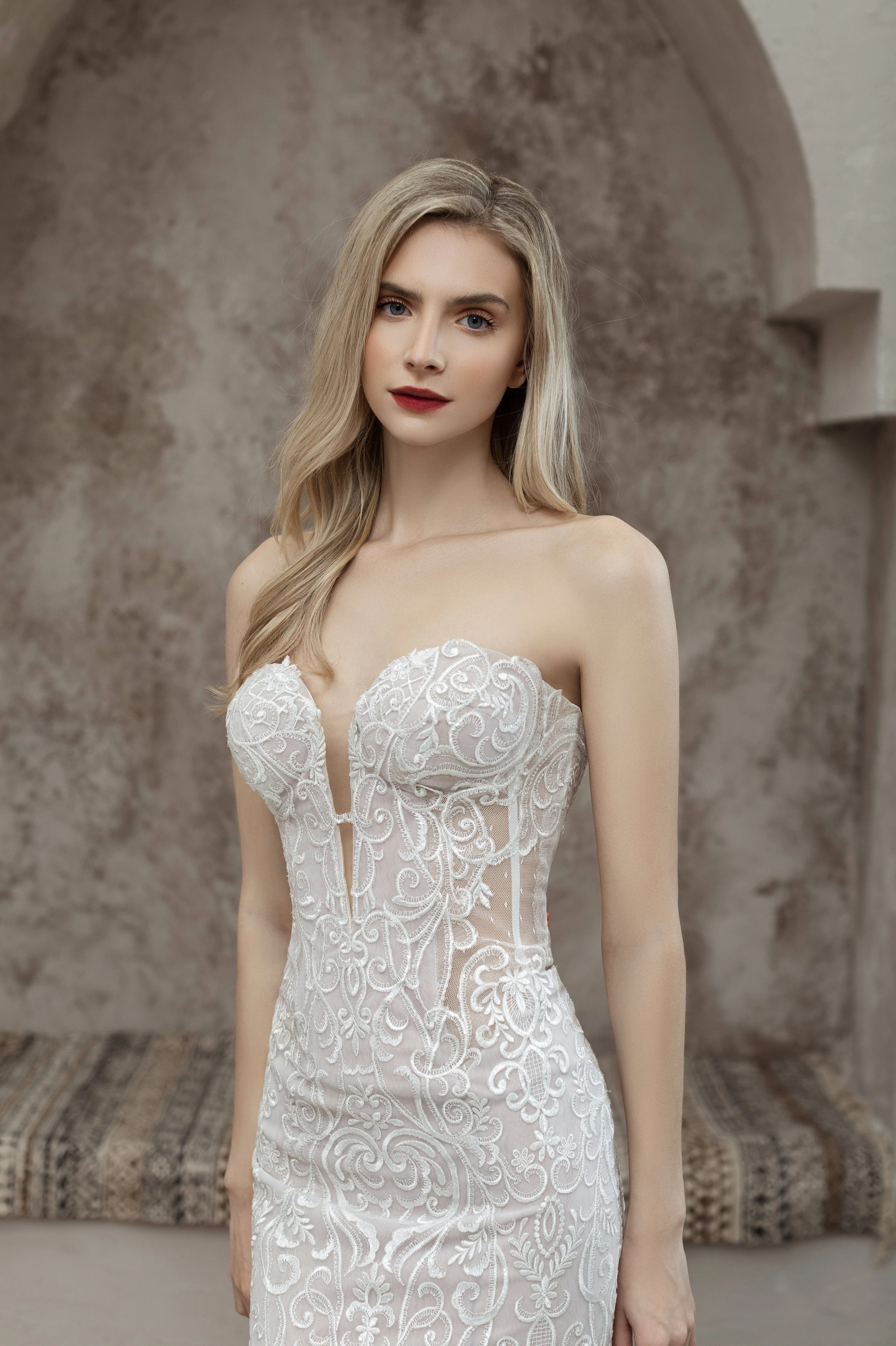 Looking for a breathtakingly romantic wedding dress? Fall in love with our Anthurium gown! This stunning mermaid dress features a plunging neckline and sheer back, ensuring you'll look and feel your sexiest on your big day. The unique lace design and figure-flattering silhouette is perfect for showing off your curves, while the delicate tulle skirt adds just the right amount of drama. With its zipper back and boned structure, this dress is both comfortable and stylish. Plus, the horsehair edge on the chapel train gives it a truly unique finish. Whether you're walking down the aisle or dancing the night away, our Anthurium gown will make sure you're feeling like a goddess.