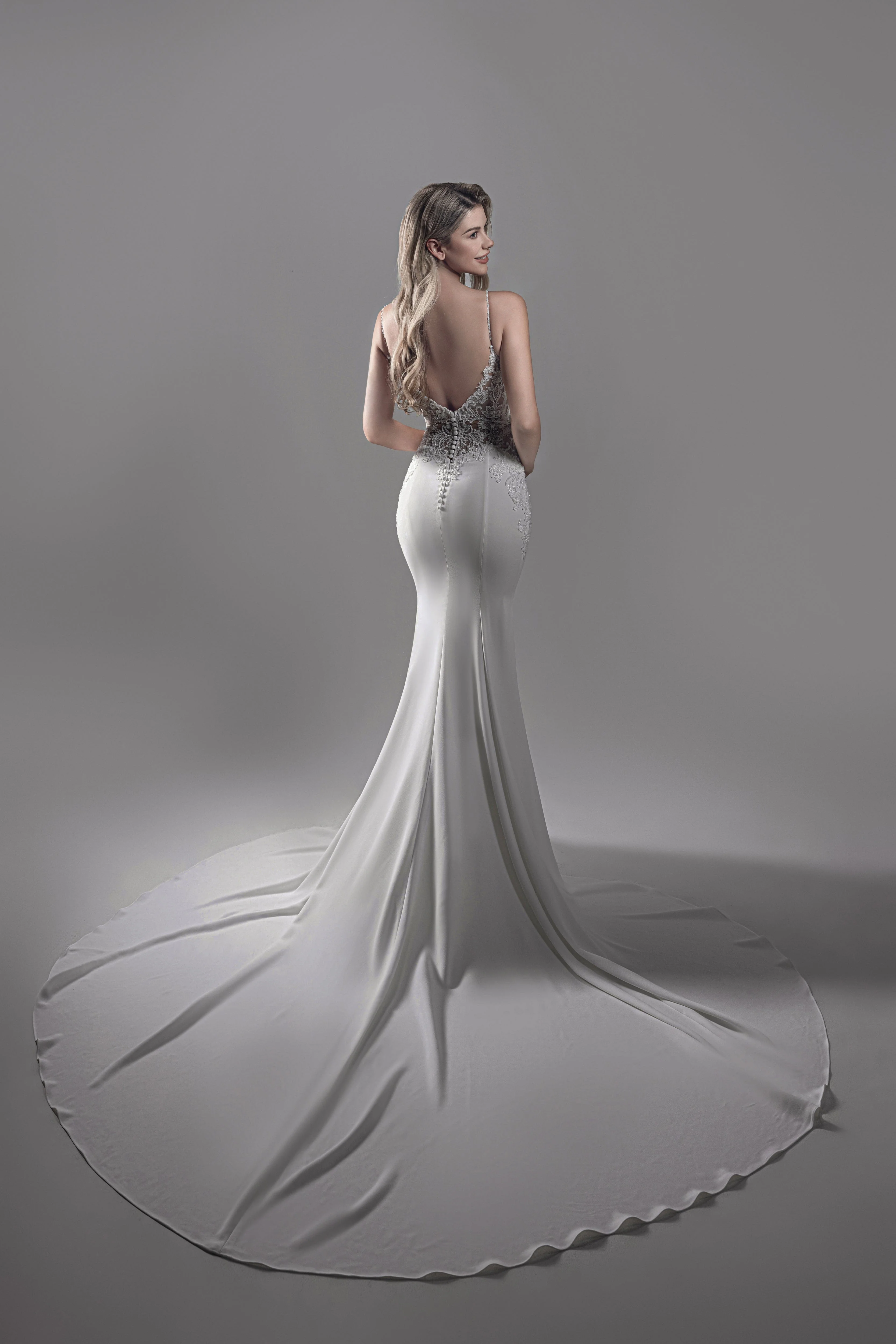 This romantic wedding dress features beaded spaghetti straps, luxurious chantilly lace bodice, and a low back design. The creep fit and flare skirt flows out softly along the legs with the chapel train completing the look. This dress is perfect for the modern bride who wants to feel glamorous and elegant on her big day.