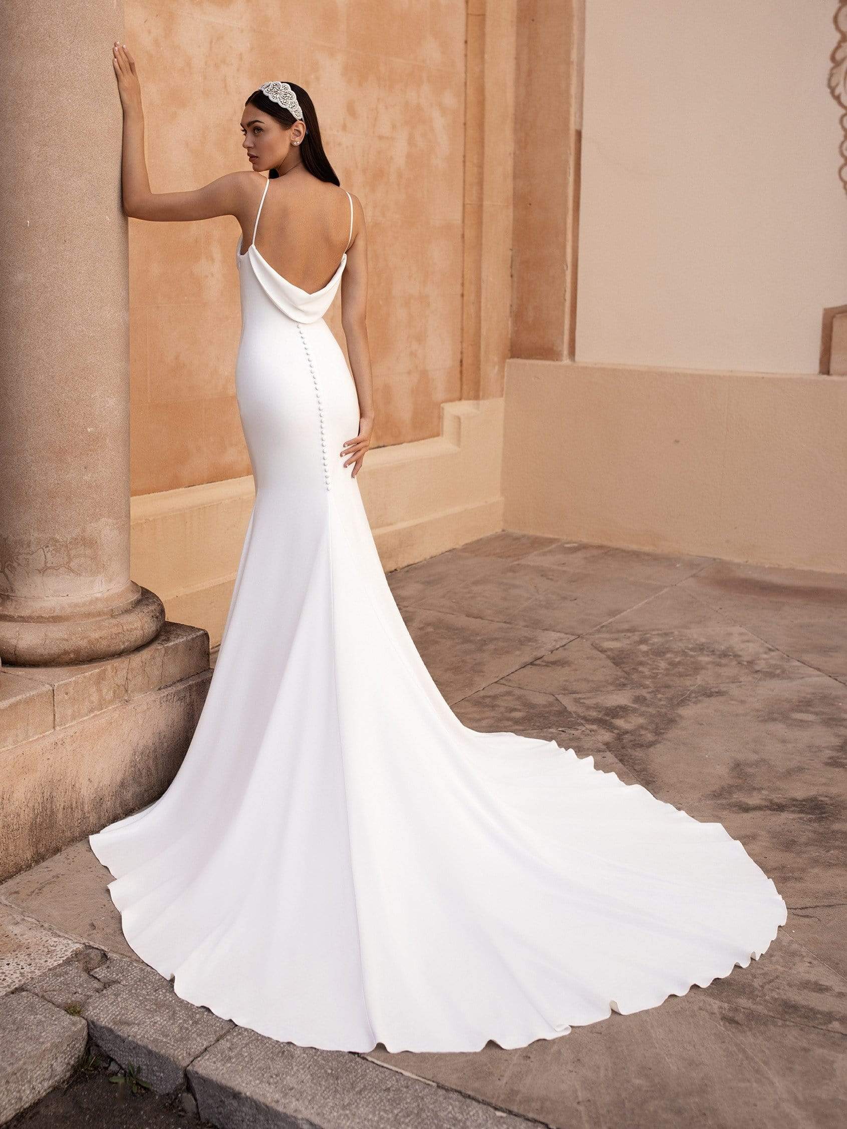 A creamy, all-crepe masterpiece with chic spaghetti straps, a fitted waist, a low-volume skirt, and loose draping along the neckline and back.