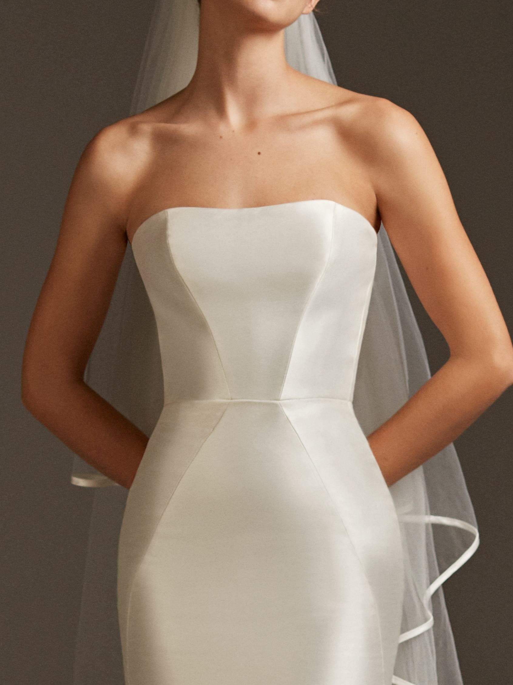 Strapless mermaid dress in mikado with form-flattering seams and floor-length buttons on back.
